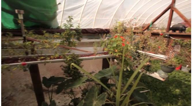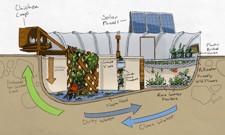 Instead of commercial fertilizer, chicken droppings fall through wire mesh strung across the pool’s deep end, nourishing the algae and duckweed in the pond below. The tilapia eat the pond plants, release their own nitrogen-rich excrement, and the fish water then gets funneled (using a solar-powered electric pump) into the hydroponics system that grows the family produce.